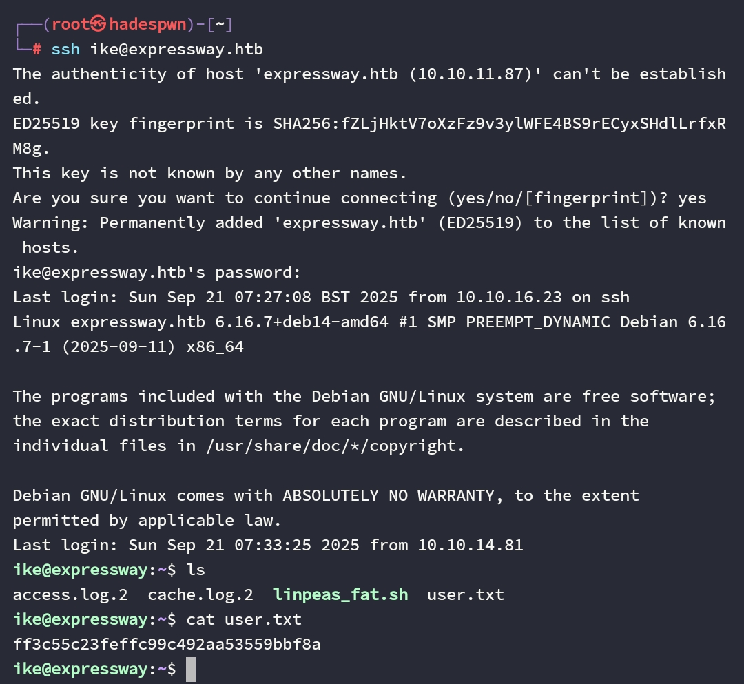 Setelah kita mendapatkan password diatas, saya coba login menggubakan ssh untuk ike@expressway dan berhasil masuk.